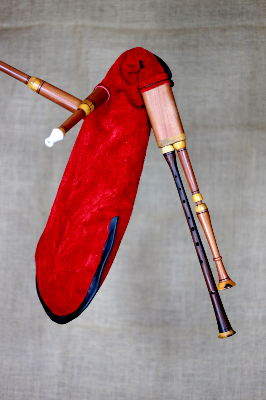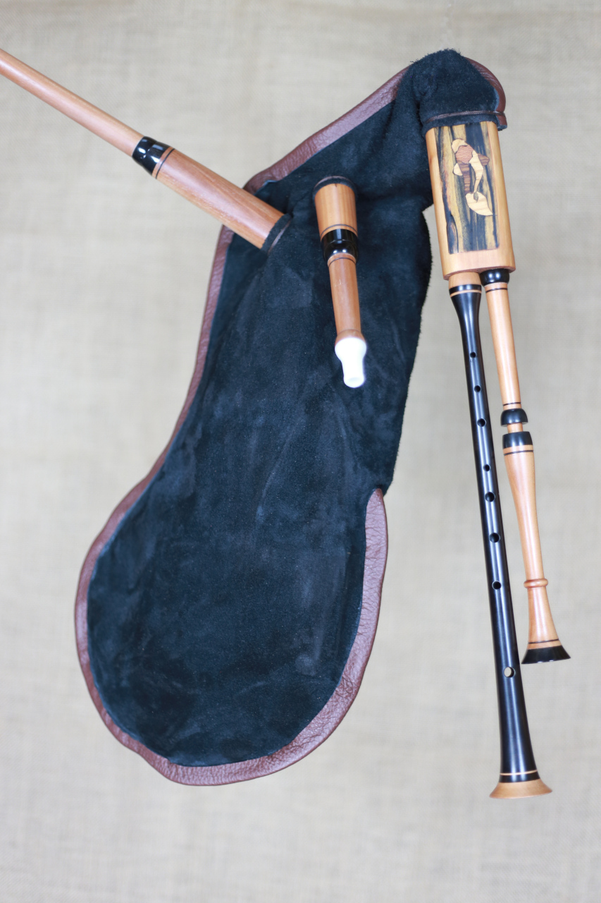 Schäferpfife double tonalité (Do et Ré), bourdons ajustables 1/4 de tour, deux hautbois 10 et 13 pouces. Ici avec le hautbois de 10 pouces